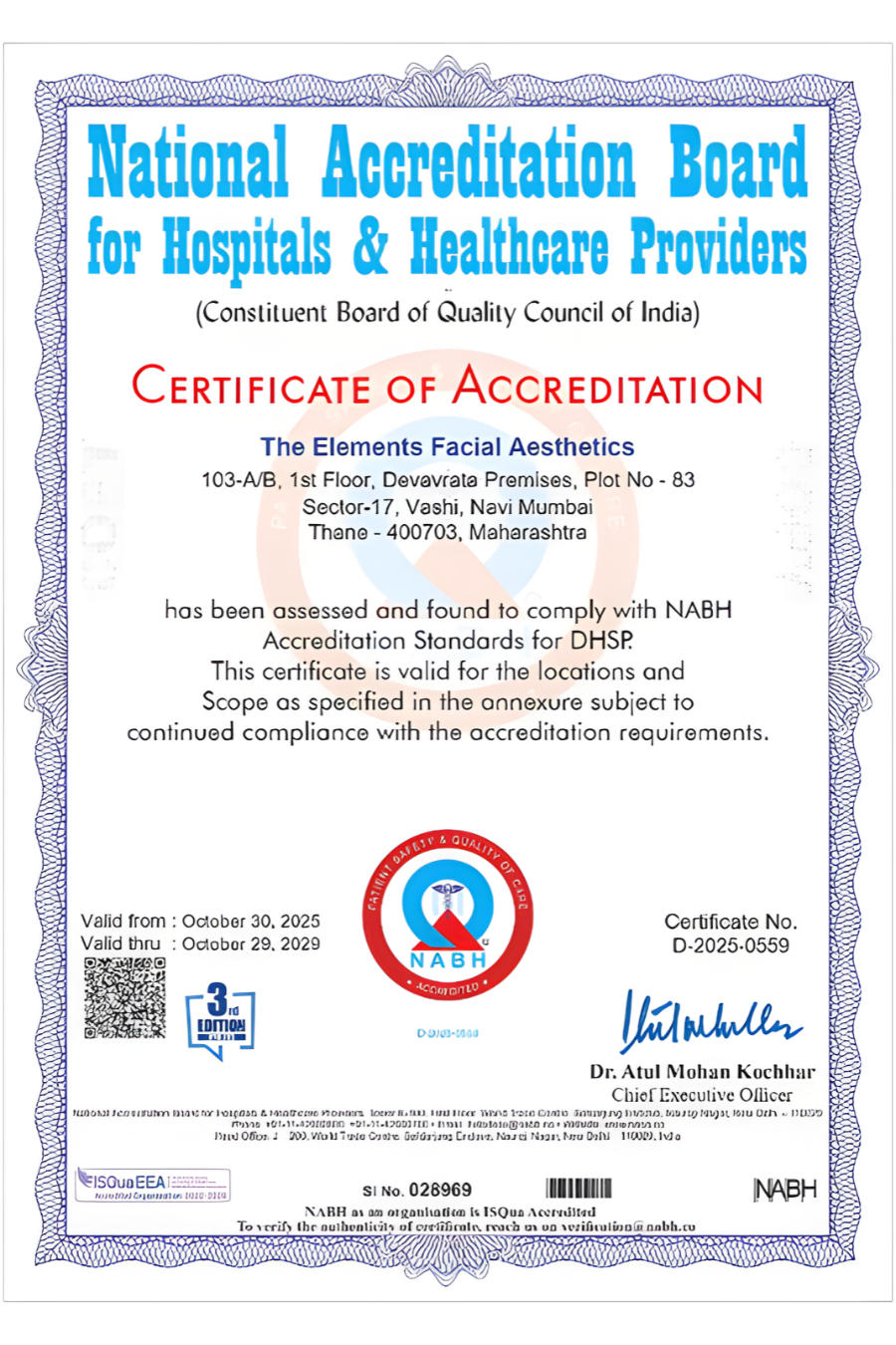 “The elements” is the only NABH accredited Super Specialty Dental Clinic in Navi Mumbai that is also QCI and ISO 9001:2015 certified for quality control and best services. Being one of the top dental clinics not only in in Vashi, Navi Mumbai, Mumbai but also Maharashtra, we operate on the principle of delivering the knowledge of diverse dental surgery specialists to offer the highest quality dental care to patients